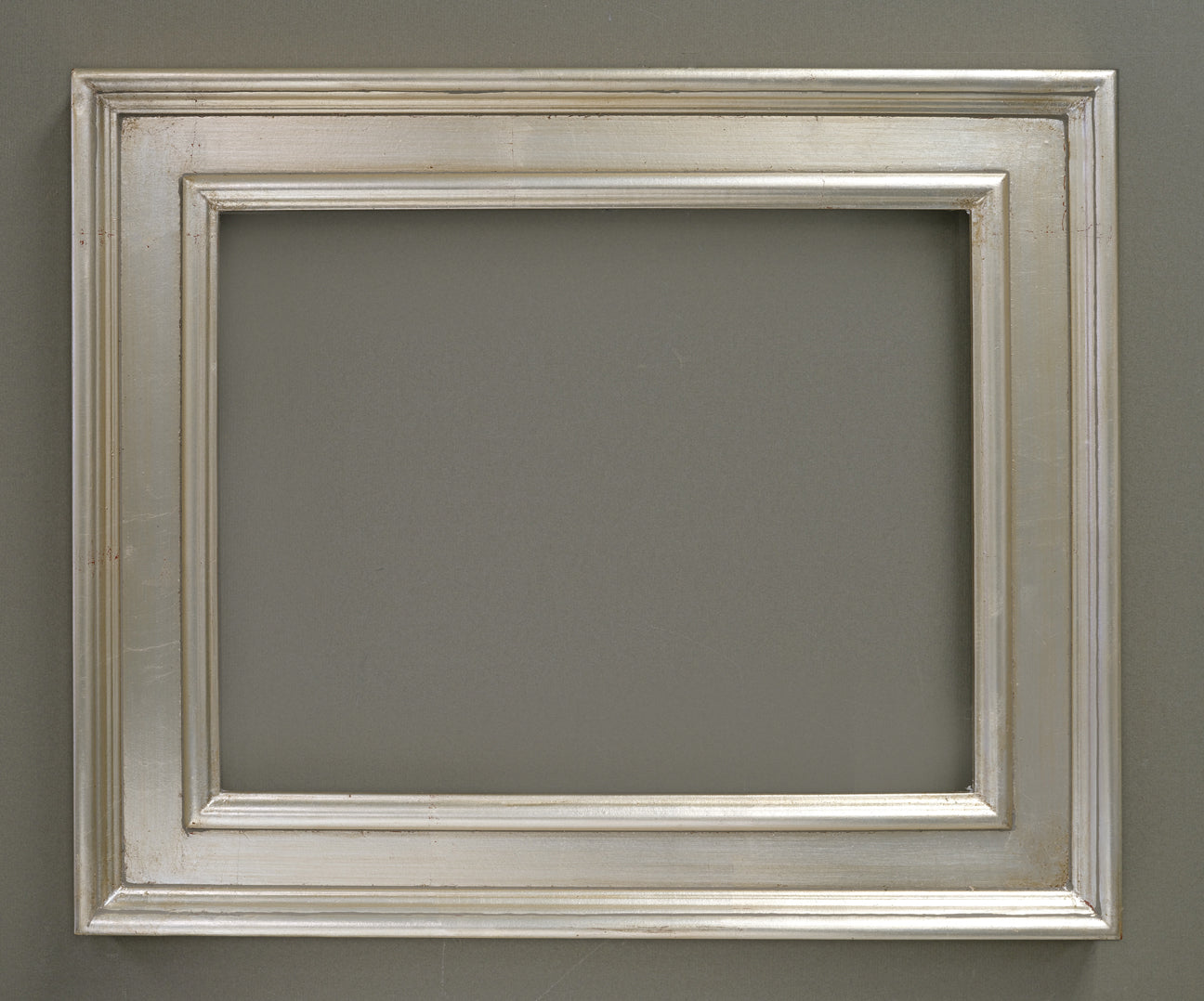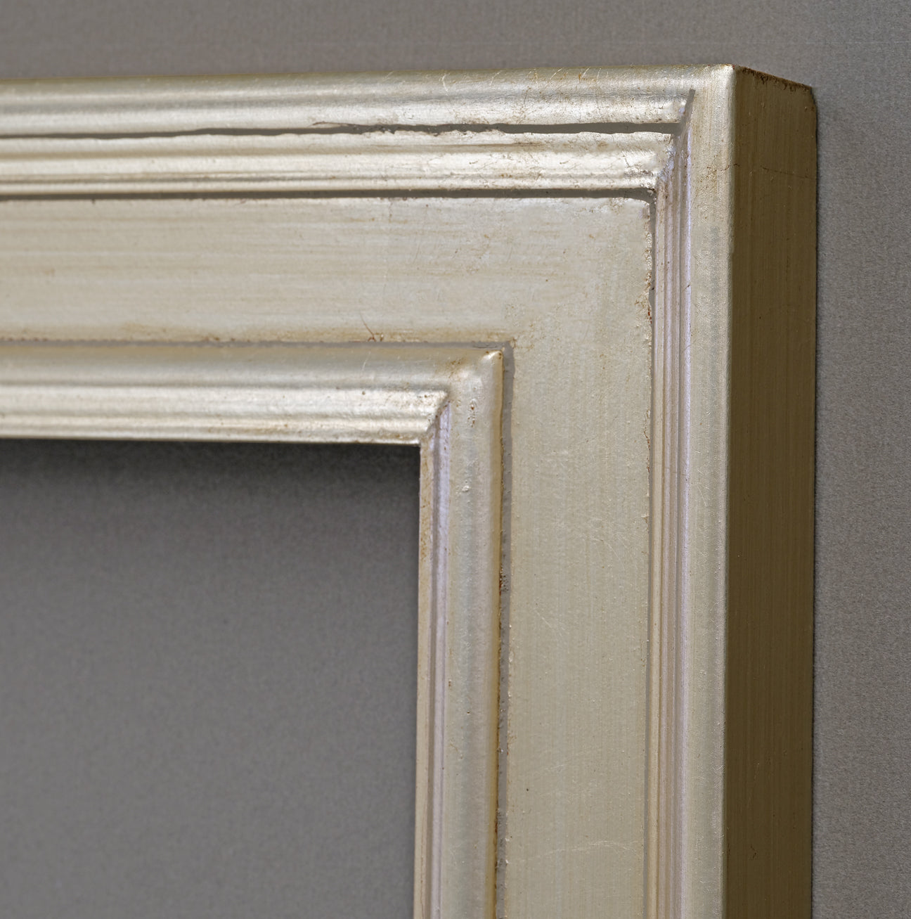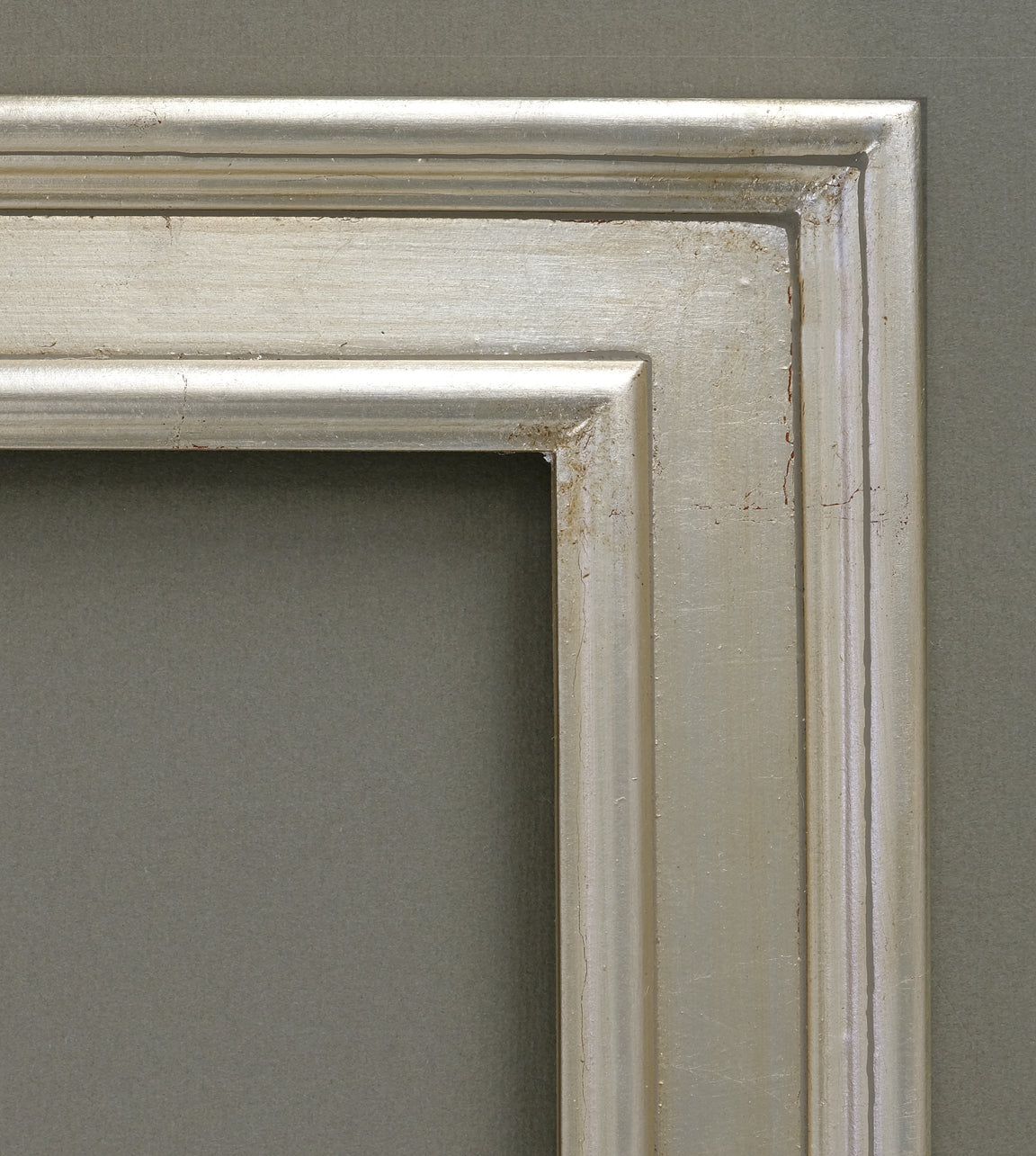 All wood, cut and joined closed corner frame. Rustic, silver finish.